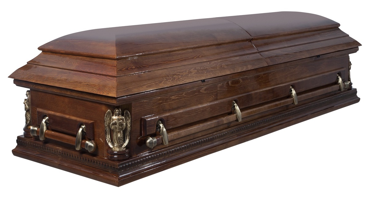 Гроб двухкрышечный "Виктория" с ангелами представляет собой изысканный образец ритуального искусства, сочетающий в себе элегантность и символическую глубину. Его дизайн выполнен в классическом стиле, что делает его подходящим для проведения церемоний прощания и возложения на кладбище. Гроб обитый тканью, отличается плотной окантовкой и декоративной отделкой, что придаёт ему особую торжественность.