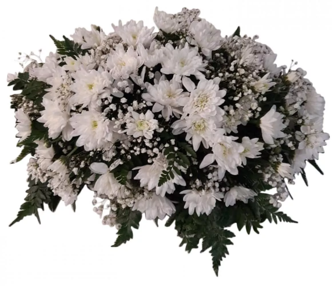 Композиция на гроб с белыми хризантемами 50 см подходит для различных сценариев: будь то похороны, церемония прощания или памятные даты. Она станет достойным выражением скорби и уважения к ушедшему, подчеркнув важность момента последнего прощания. Эта композиция также может быть использована как часть ритуальных принадлежностей на кладбище, добавляя нотку изящества и благородства в общий антураж.