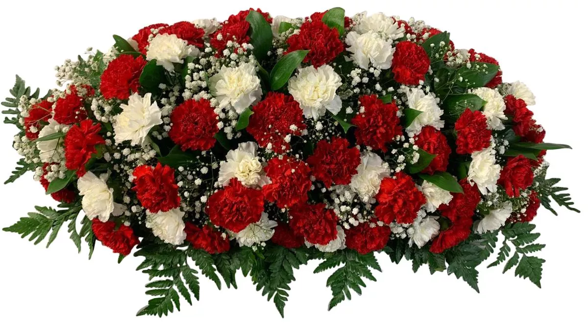 Композиция на гроб с красно-белыми гвоздиками 100 см