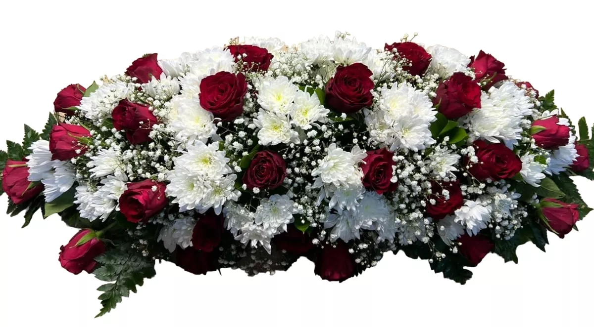 Эта композиция из искусственных цветов выполнена с особым вниманием к деталям. Плотная окантовка и аккуратная обивка обеспечивают долговечность и презентабельный вид. Искусственные цветы сохраняют свою красоту независимо от погодных условий, что делает их подходящими для использования как в помещении, так и на открытом воздухе. Композиция длиной 100 см гармонично ложится на гроб, подчеркивая его формы и создавая завершенный образ.