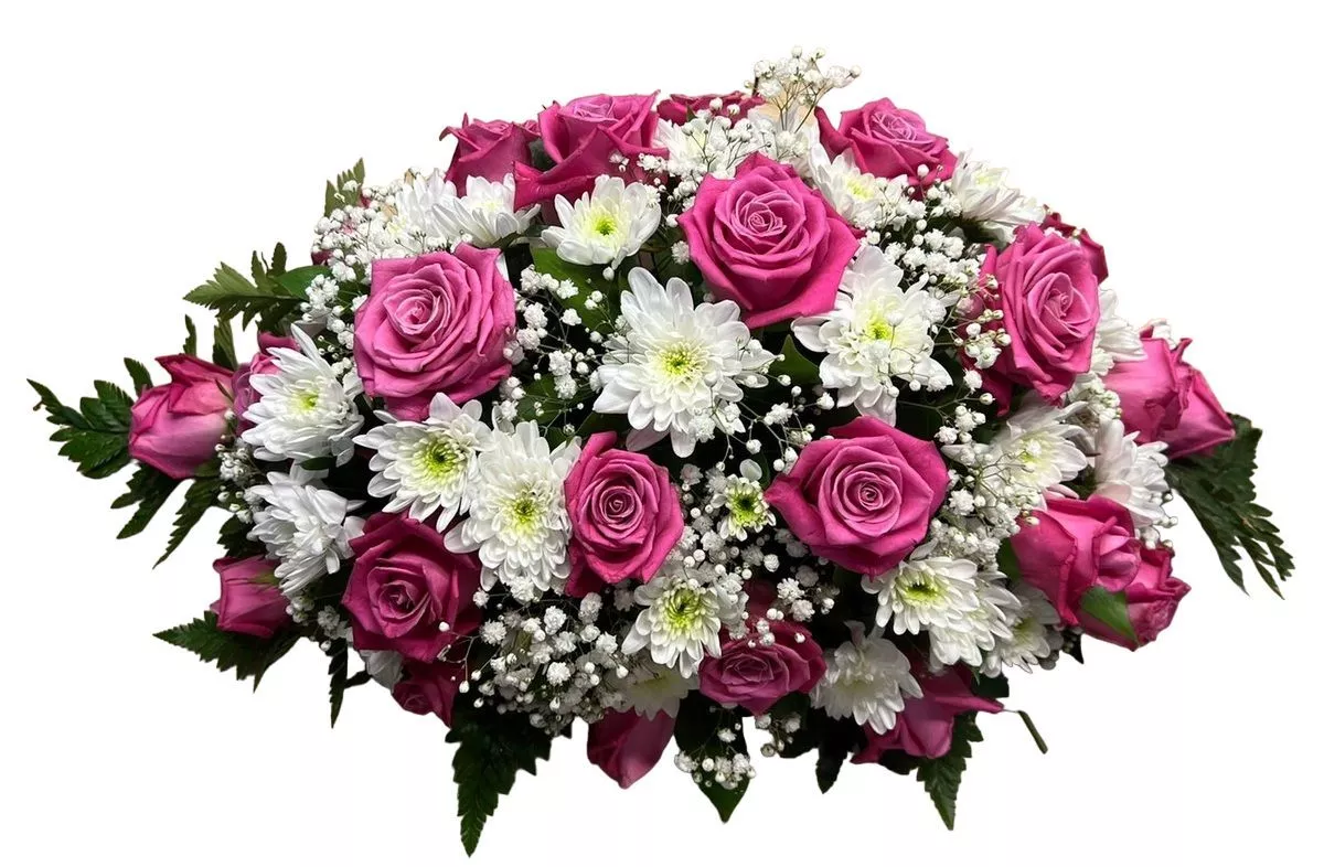 Композиция на гроб с розовыми розами и хризантемами 50 см — это утончённое сочетание, которое придаст особую торжественность моменту прощания. Розовые розы, символизирующие любовь и благодарность, гармонично сочетаются с белыми хризантемами, традиционно ассоциирующимися с уважением и памятью. Эта композиция станет достойным украшением ритуального гроба, подчеркивая значимость церемонии прощания и выражая глубокие чувства к ушедшему.