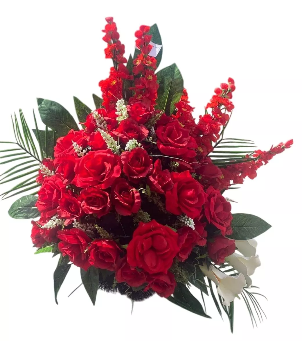 Корзина "Ладья" малая элит красная — это изысканное ритуальное изделие, которое станет достойным украшением любой траурной церемонии. Её яркий красный цвет символизирует любовь и уважение, а также выражает глубокие чувства скорби и памяти. Композиция из искусственных цветов, выполненная с вниманием к деталям, создаёт впечатление живого букета, что делает её подходящей для возложения на могилу или в качестве элемента прощальной церемонии.
