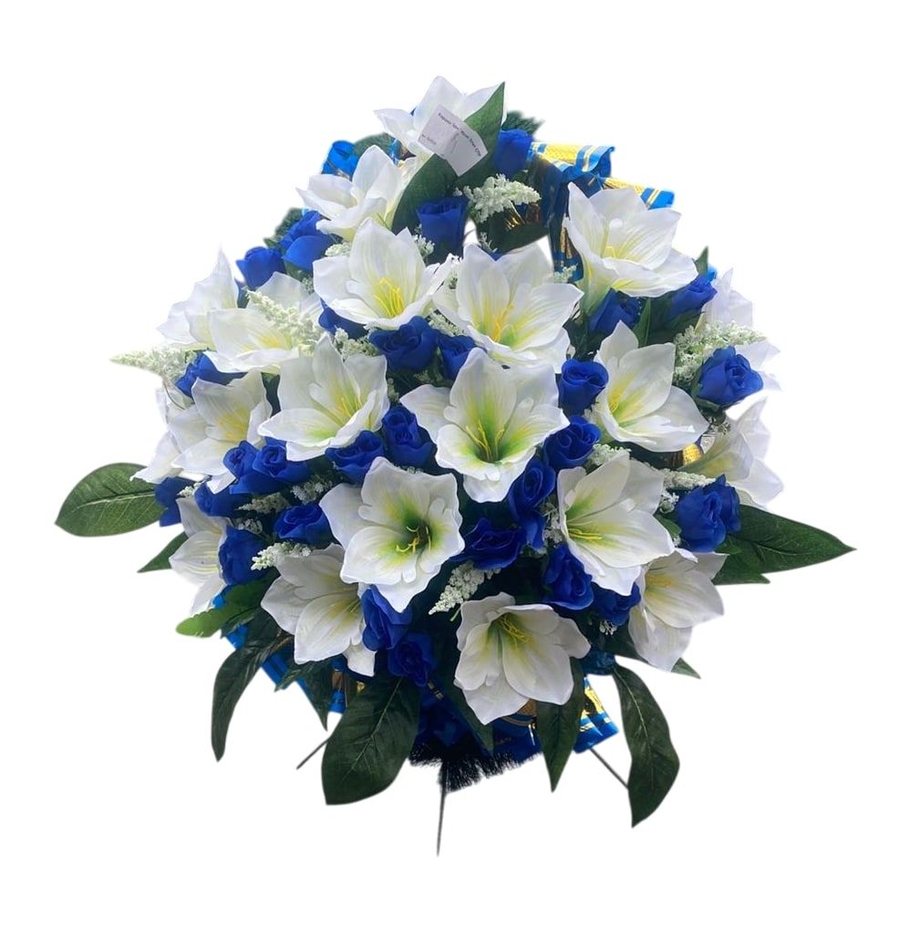 Корзина "Ладья" малая элит сине-белая — это изысканный ритуальный венок, который сочетает в себе элегантность и утонченность. Изготовленная с вниманием к деталям, она представляет собой гармоничную композицию из искусственных цветов, выполненных в сине-белой гамме. Белоснежные цветы символизируют чистоту и светлую память, а насыщенные синие оттенки добавляют глубину и торжественность. Плотная окантовка корзины обеспечивает её устойчивость и долговечность, а декоративная отделка придаёт изделию завершённый вид.