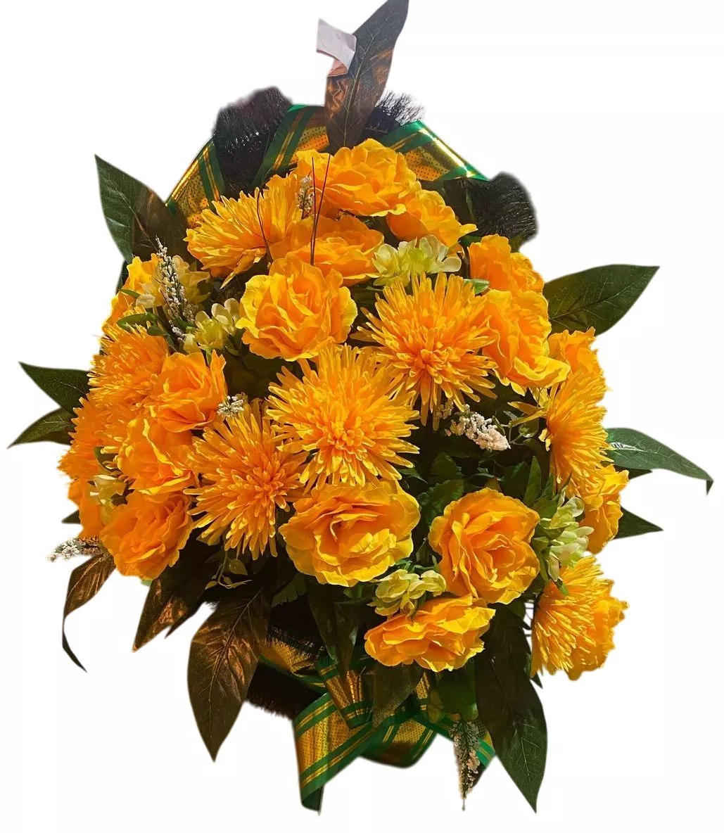 Корзина "Ладья" малая элит желтая — это изысканный ритуальный венок, который станет достойным символом памяти и уважения на церемонии прощания. Яркий жёлтый оттенок искусственных цветов придаёт композиции особую выразительность и торжественность. Декоративная отделка в виде плотной окантовки и аккуратная обивка создают впечатление завершённости и гармонии, подчеркивая элегантность изделия.