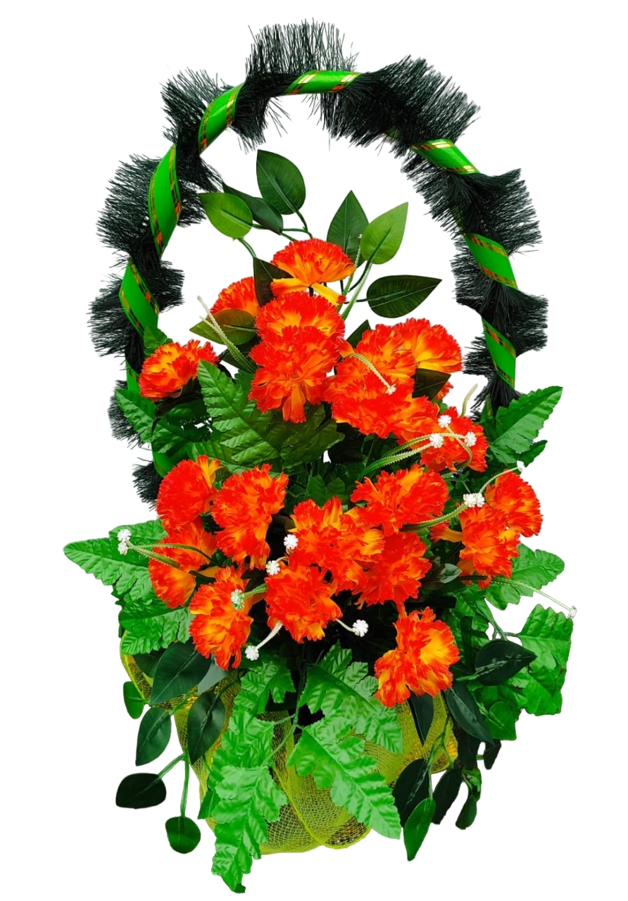 Корзина "Стульчик" заказ оранжевая — это изысканное ритуальное изделие, которое станет достойным элементом церемонии прощания. Яркие оранжевые цветы в сочетании с насыщенной зеленью создают выразительную композицию, которая привлекает внимание и вызывает чувства светлой памяти. Искусственные цветы, использованные в корзине, отличаются высокой степенью реалистичности и долговечности, что делает её идеальным выбором для возложения на могилу или использования в качестве похоронного венка.