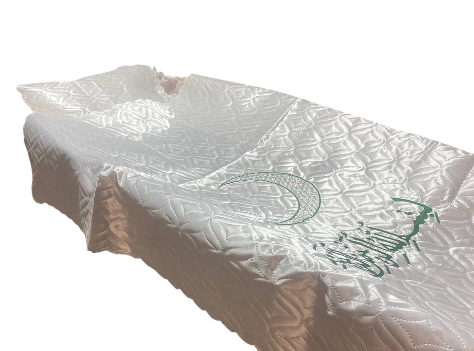 Набор для погребения стеганный с мусульманской символикой — это изделие, созданное с уважением к традициям и обычаям. Его белоснежная поверхность украшена символами, которые имеют глубокое значение в мусульманской культуре. Плотная окантовка и аккуратная обивка тканью придают набору изысканный вид, делая его идеальным выбором для церемонии прощания и последующего возложения на могилу.