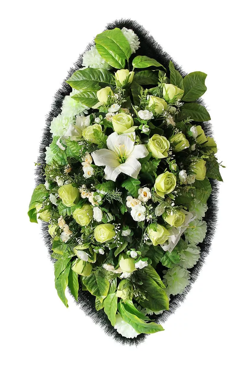 Венок "Элит" №27 — это изысканный ритуальный венок, который станет достойным символом памяти и уважения. Его утонченная композиция из искусственных цветов создает атмосферу спокойствия и умиротворения. Белоснежные лилии и розы в сочетании с нежными зелеными листьями придают изделию элегантность и торжественность, что делает его подходящим для церемонии прощания и возложения на могилу.