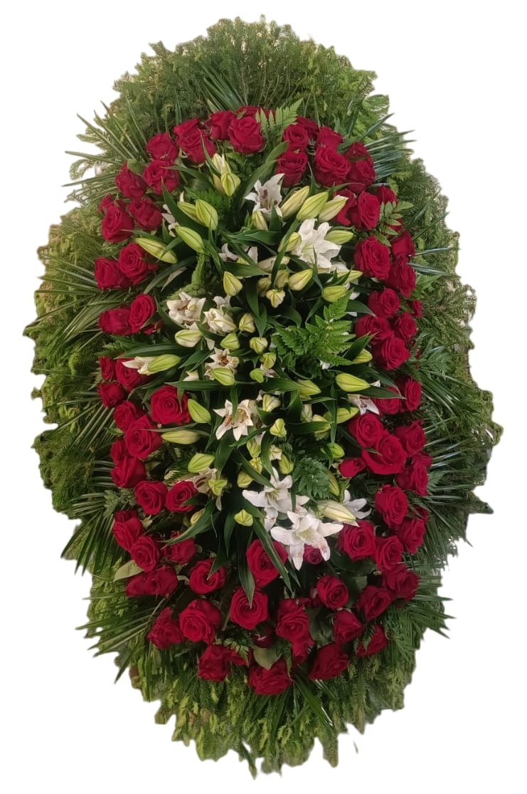 Венок из живых цветов 2 — это изысканная композиция, созданная для выражения глубокого уважения и скорби. Этот ритуальный венок идеально подходит для церемоний прощания и возложения на могилу, сочетая в себе красоту свежих цветов и элегантность классического оформления. В его основе лежат яркие красные розы, символизирующие любовь и уважение, которые гармонично соседствуют с белыми лилиями, олицетворяющими чистоту и покой. Плотная окантовка из зелени придаёт композиции завершённый вид и подчёркивает её естественную красоту.